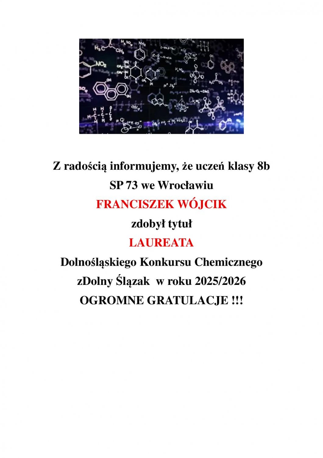 AktualnościNawigacja » Start » AktualnościUczeń naszej szkoły Laureatem zDolnego Ślązaka z chemii18 marca 2026 | Maria Izworska | Powrót do spisu wiadomości