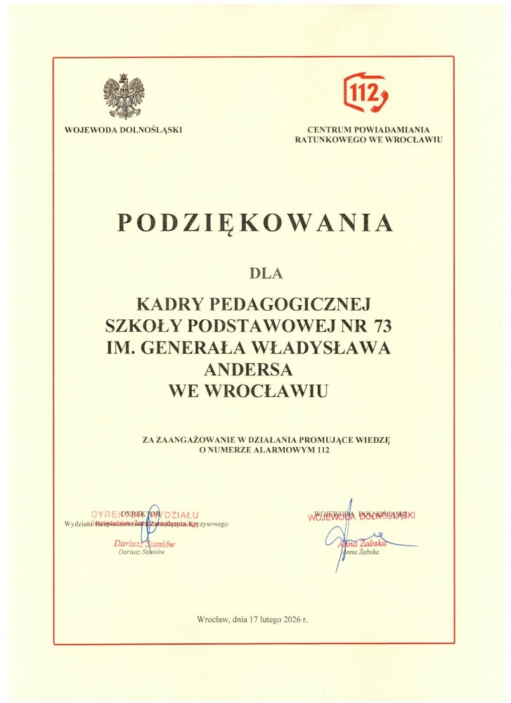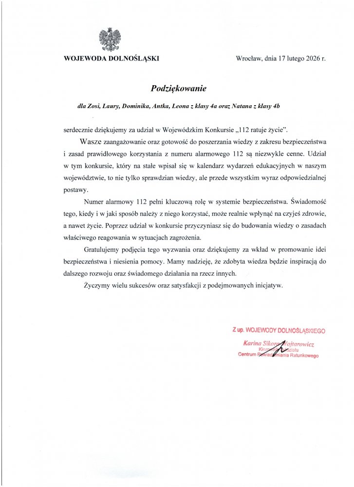 W styczniu 2026 roku uczniowie klas IVa i IVb wzięli udział w WOJEWÓDZKIM KONKURSIE „112 – ratuje życie” w kategorii wiersz i rymowanka.