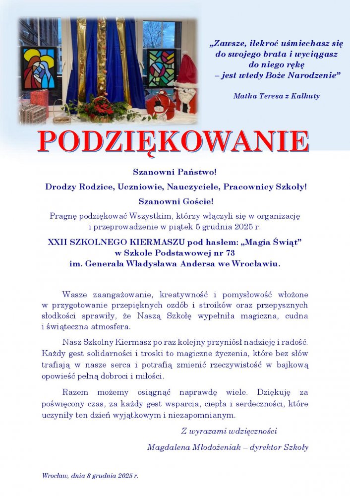Szkoła Podstawowa nr 73 im. Generała Władysława Andersa dołącza do VIII Charytatywnej Sztafety Pływackiej! Wszystkie zebrane środki wspierają Fundację Wrocławskie Hospicjum dla Dzieci, która przeznacza je na zakup niezbędnych materiałów medycznych, sprzętu rehabilitacyjnego oraz na spełnianie marzeń swoich podopiecznych.